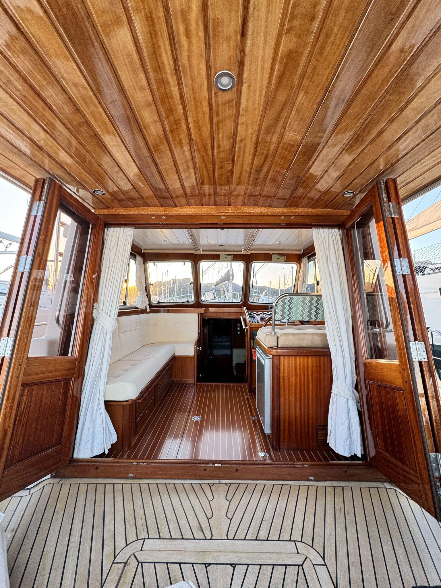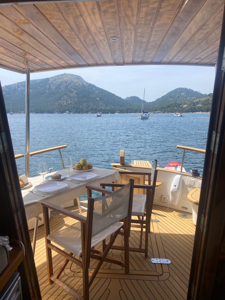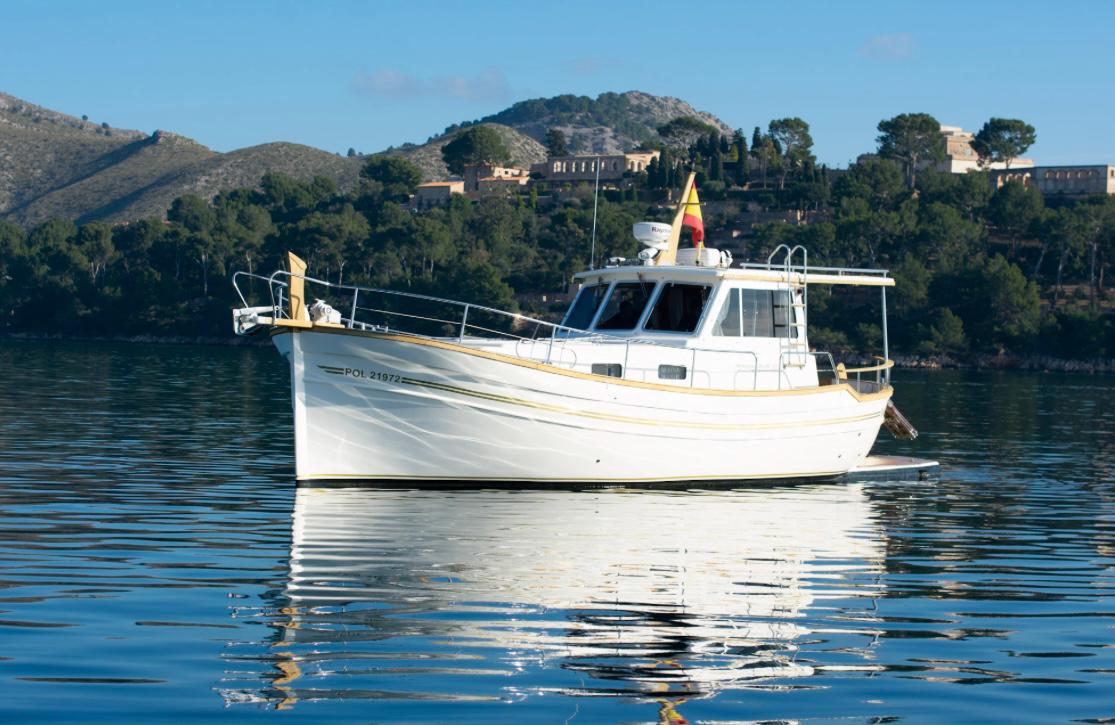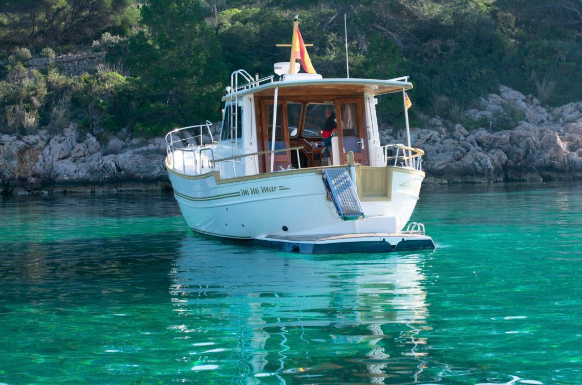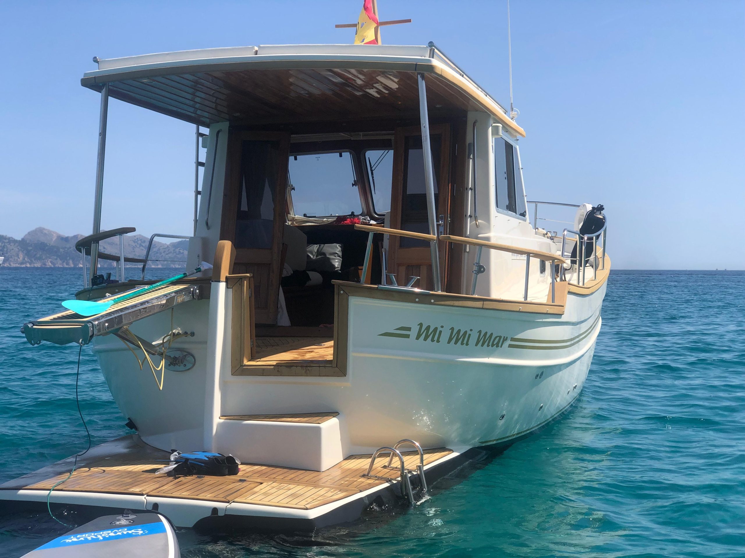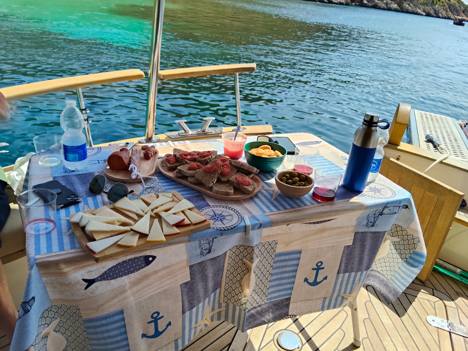 Barcos menorquín de 12 metros, con capacidad para 12 personas. Ofrecemos un servicio de bebidas de cortesía: 1 botella de champán o de vino, 4 cervezas, 4 refrescos, 4 zumos y 5 botellines de agua. También se ofrece un snack de bienvenida, tabla de diferentes quesos, fuet, oliva, sobrasada, pan mallorquín, y tomate. Además , se ofrece un padelboard, máscaras de buceo.